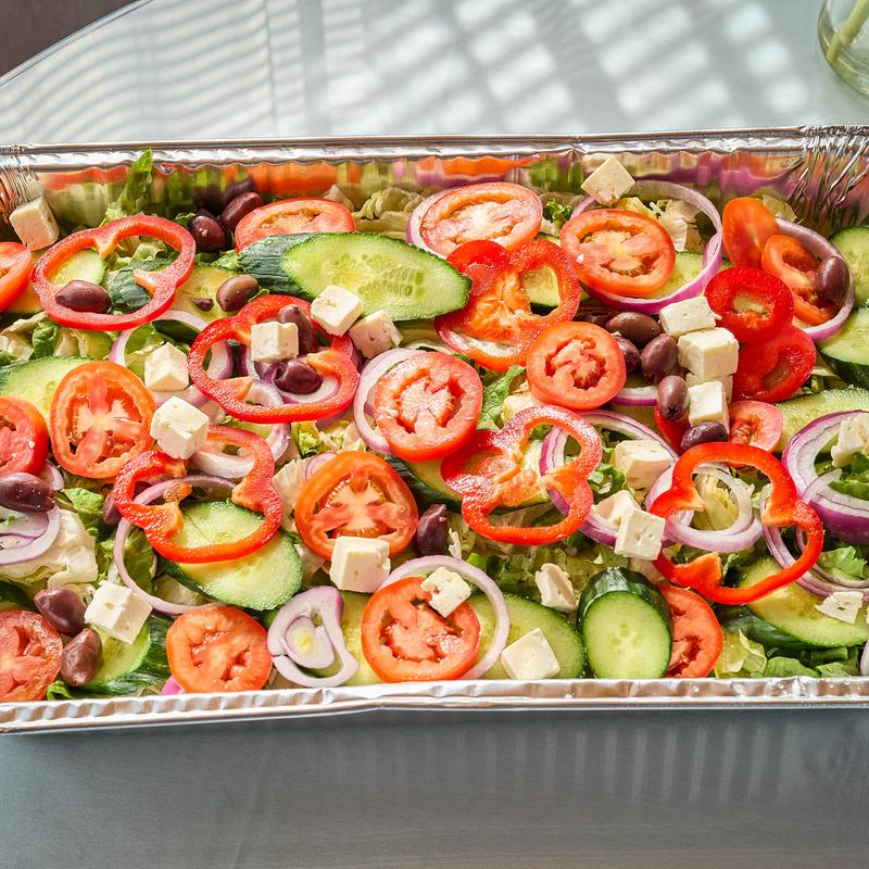 Small $35.00 | Large $75.00 • Chopped iceberg & spring mix blend topped with tomatoes, red onions, kalamata olives, cucumbers, pepperoncini, feta cheese, and our homemade Greek dressing